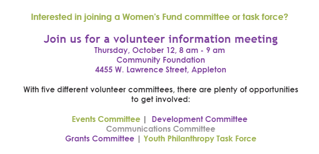 Want to learn more about the Women’s Fund and how you might get involved? Join us at the Volunteer Information Meeting on October 12! Meet other committee volunteers and learn how your interests and talents can be used to help women and girls in the Fox Valley.