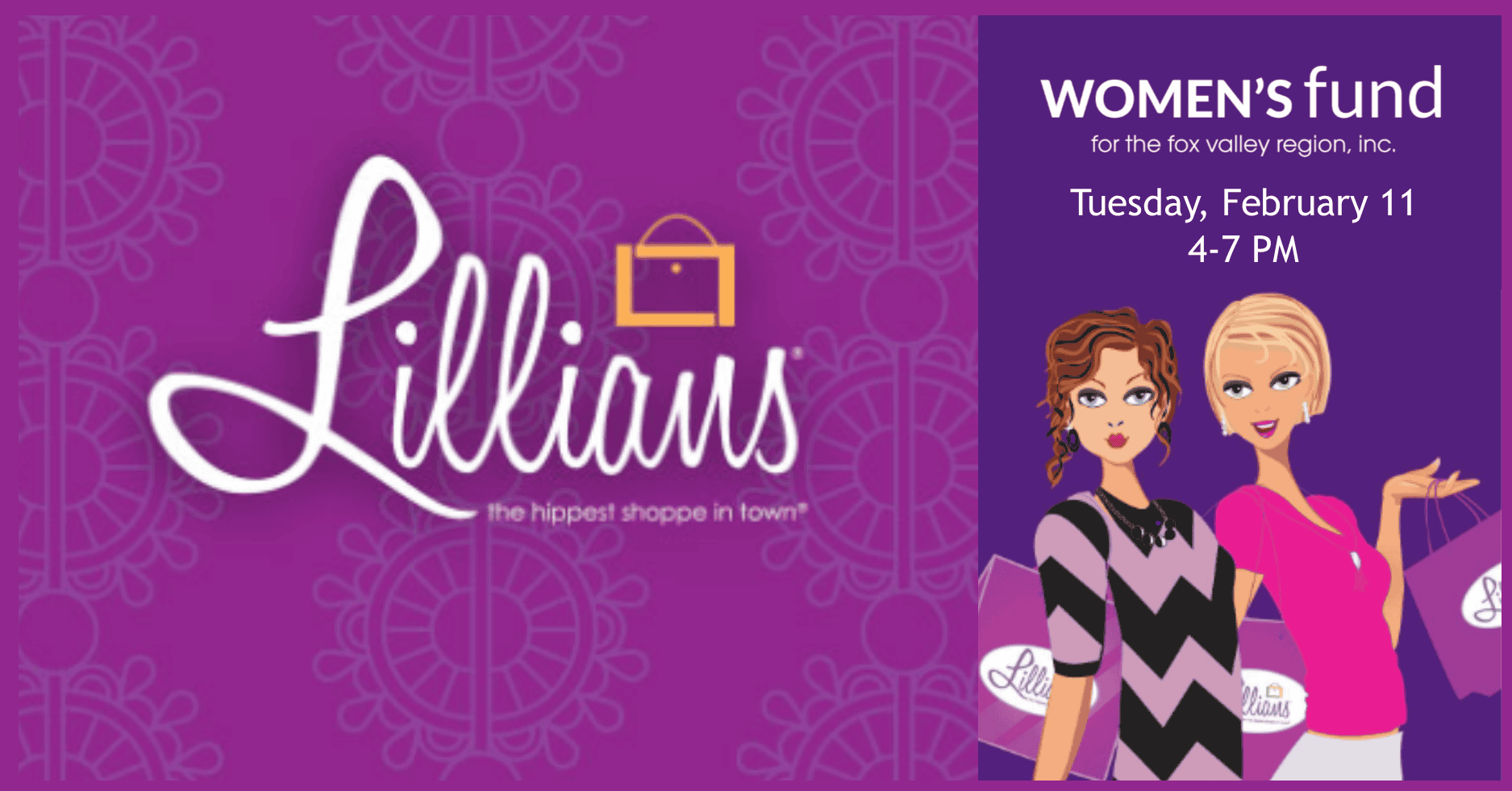 Get the latest spring styles when you shop Lillian’s of Appleton on Tuesday, February 11. Save 20% and a portion of all sales will go to the Women’s Fund! Win! Win! This will be a fun night that you won’t want to miss. See you there!
